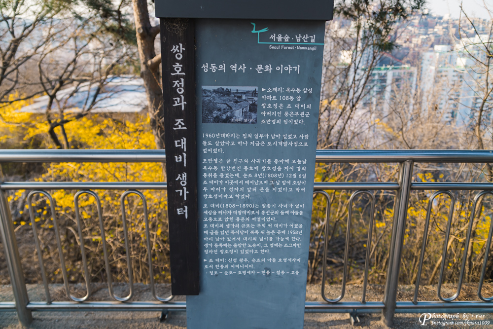 공원 북쪽에는 막혀 있는 느낌인데, 서울숲-남산길에 있는 역사 장소 등을 소개하는 읽을거리가 있어 조금 읽어 봤습니다. 그런데 글이 너무 바닥까지 내려져 있어서 인지.. 저는 가독성이 떨어져서 다 읽어 보지 못하고 자리를 옮겼네요. ^^;