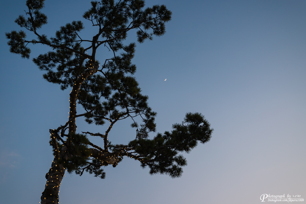 해가 지고 나니 달이 선명히 보이기 시작했고, 응봉산 정상의 소나무에서는 조명으로 나무에 수를 놓아 볼 수 있었습니다.