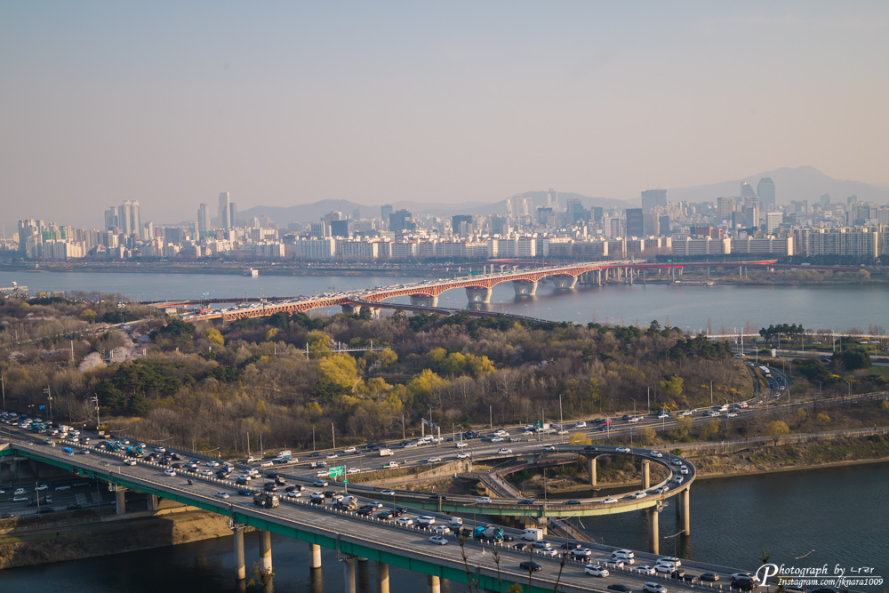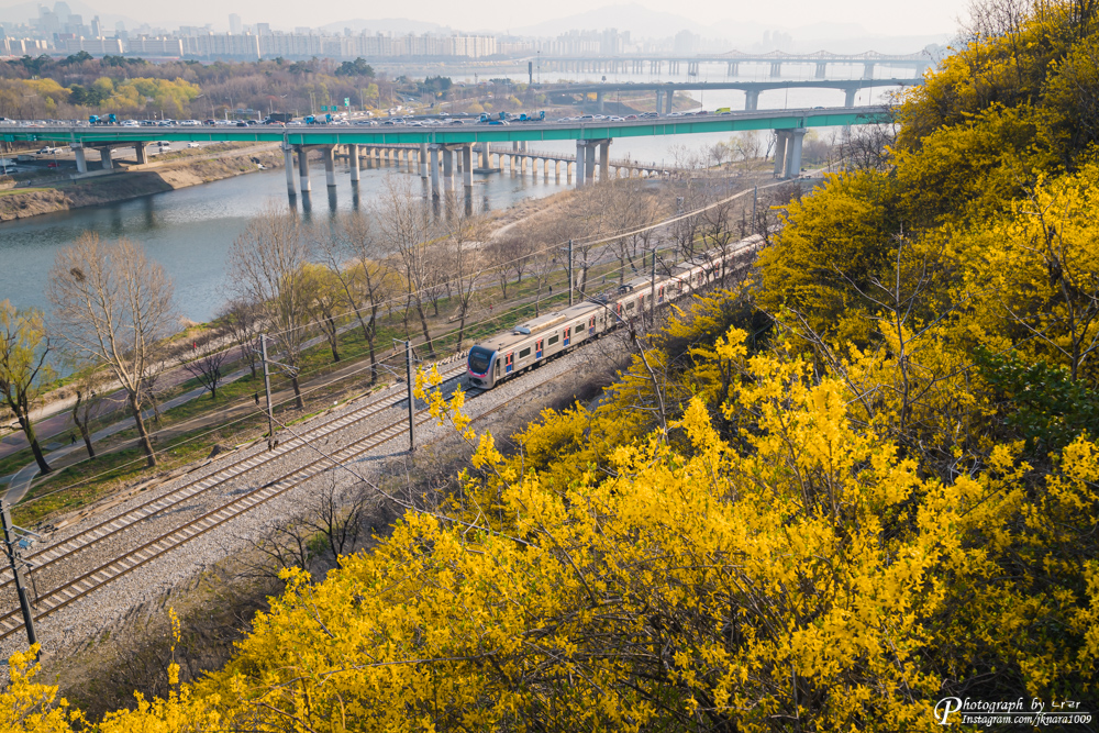 응봉산에 올라와 찍는 느낌이 들게 개나리가 가득하게 담아 봤는데요.. 어떤가요?