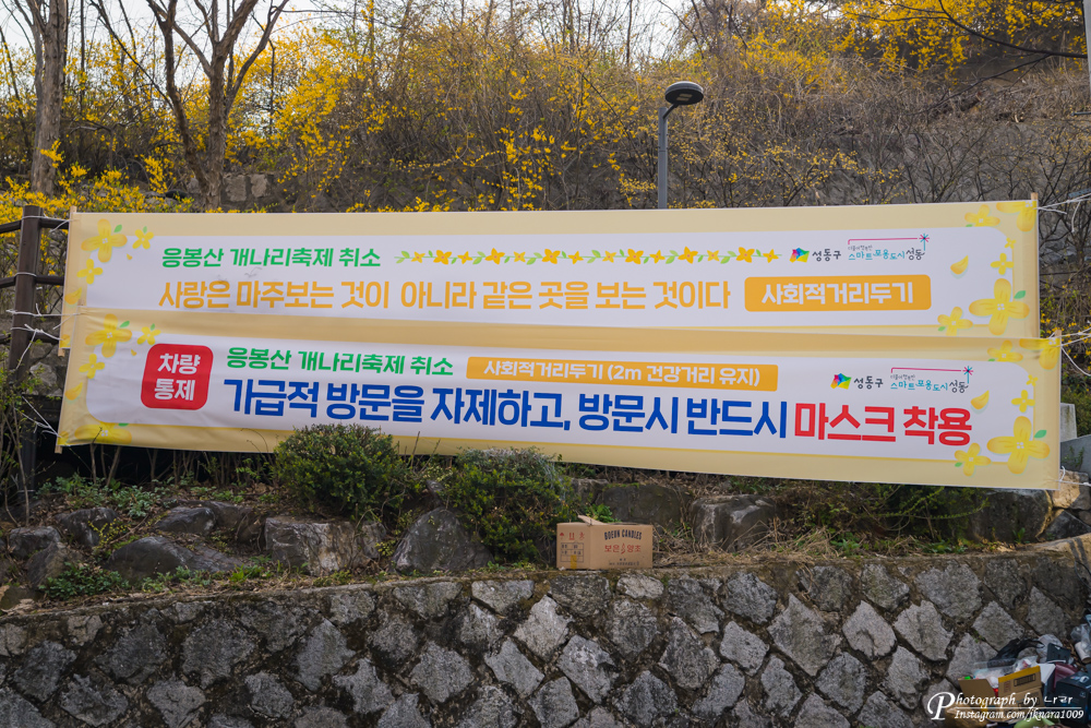 응봉산은 매년 3월 넷째 주경에 개나리 축제로 많은 관광객을 끌어들이고 있지만, 올해 2020년은 응봉산 개나리 축제가 취소가 되었습니다. 코로나 19로 인한 사회적 거리두기의 일환으로 이러한 봄 축제들이 취소가 되고 있습니다.