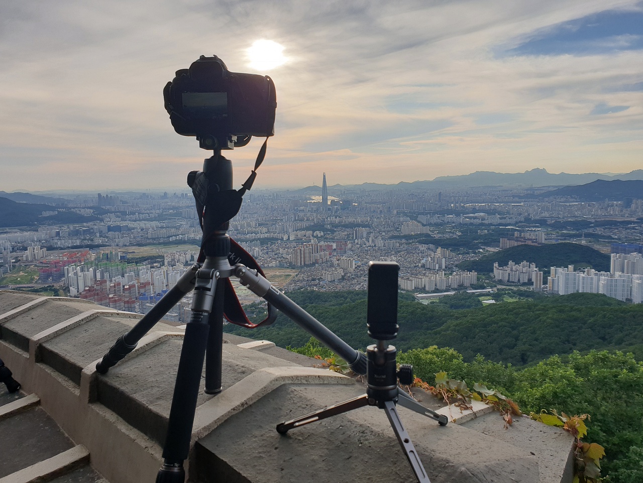 저는 이렇게 성곽 위에 올렸습니다. 삼각대 발 부분은 고무여서 성곽에 흠집을 남기거나 하지 않았어요..