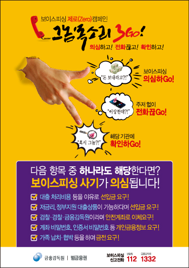 여러 매스컴을 통해서, 그리고 지방자치단체 및 각 기관마다 보이스피싱 피해를 우려하는 전단과 홍보 안내를 해오고 있습니다.