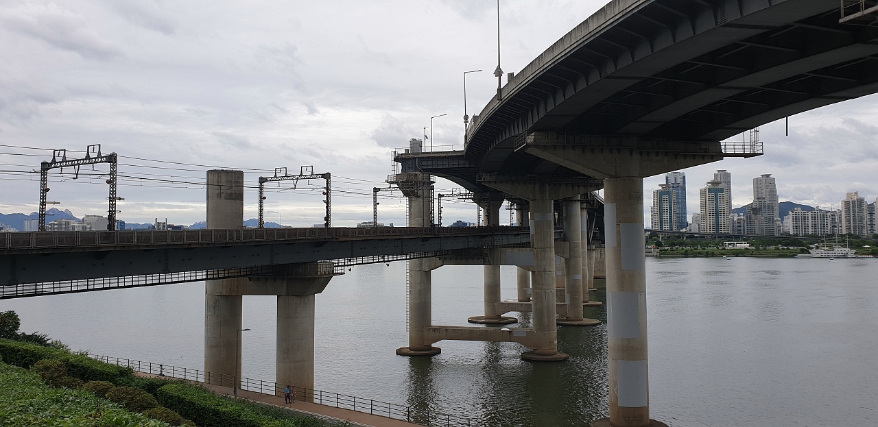 청담대교와 그 아래에는 지하철 7호선이 다니는 철길이 보이는데요.