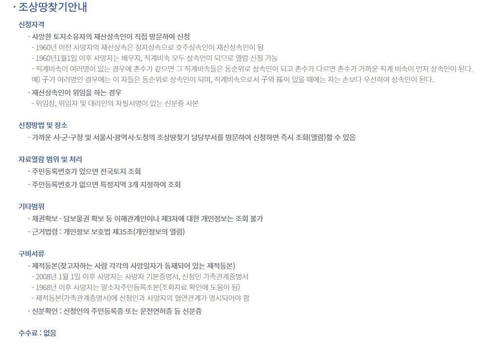 신청자격은 사망한 토지소유자의 재산 상속인이 직접 방문하여 신청할 수 있는데요.