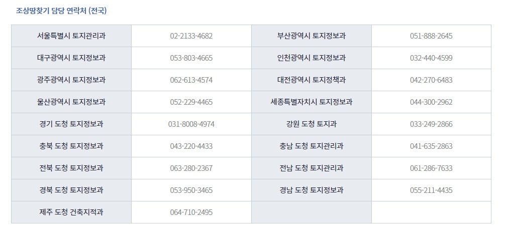 조상 땅 찾기 지역별 담당 연락처는 위 이미지의 내용을 참조하세요.