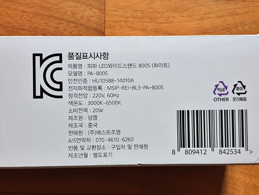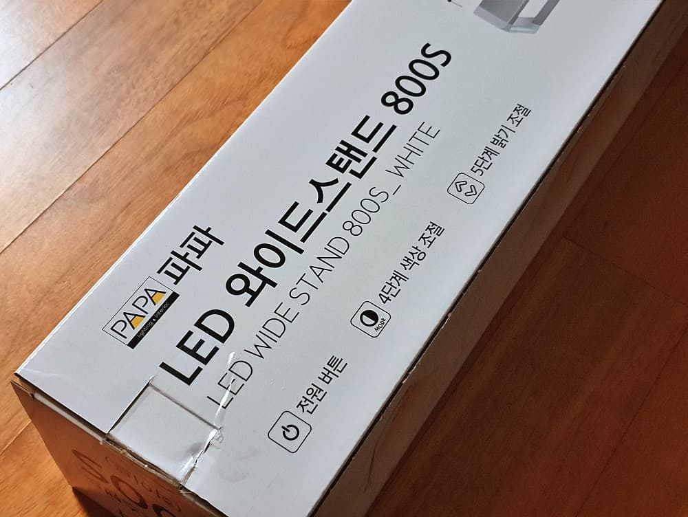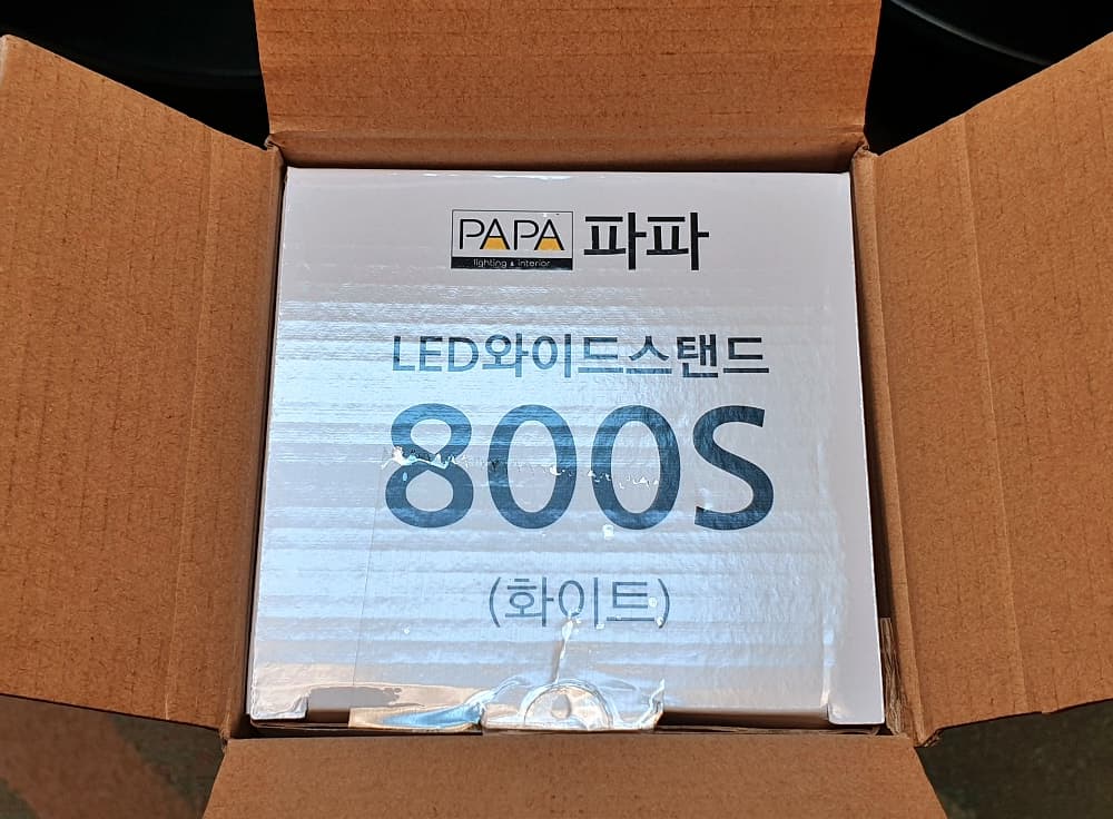 이제 진짜 박스가 보입니다. 브랜드명이 파파(PAPA)이고 제품명은 LED 와이드 스탠드 800S입니다.