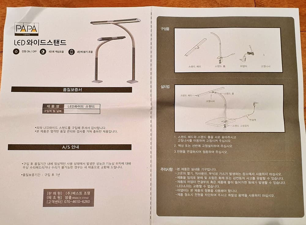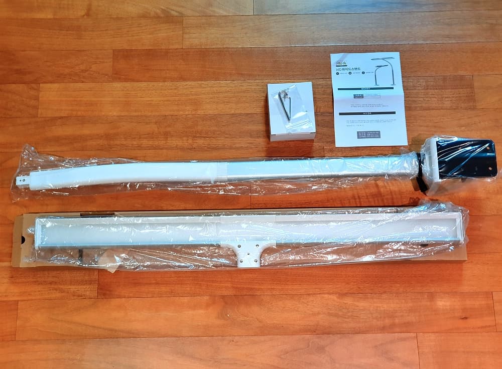 구성품을 보면, 스탠드 해드, 스탠드 폴대, 전기 어뎁터, 고정나사와 육각 랜치, 설명서 가 들어 있습니다.