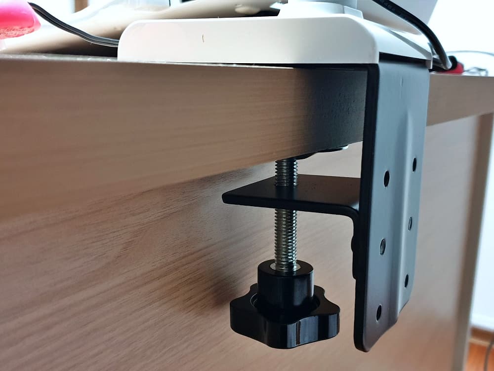 그리고 폴대를 책상 고정할 부분에 놓고 나사 손잡이를 돌려 조입니다.