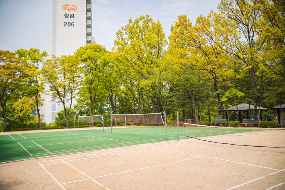 화장실도 크게 있었고, 테니스코트와 운동기구, 파고라 평상 이 있었습니다.