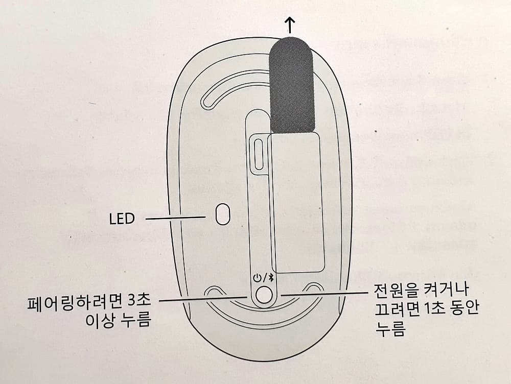 건전지가 있는 곳 뚜껑을 열고, 비닐테이프 같은걸 잡아당기니 마우스에 전력이 공급이 됩니다.