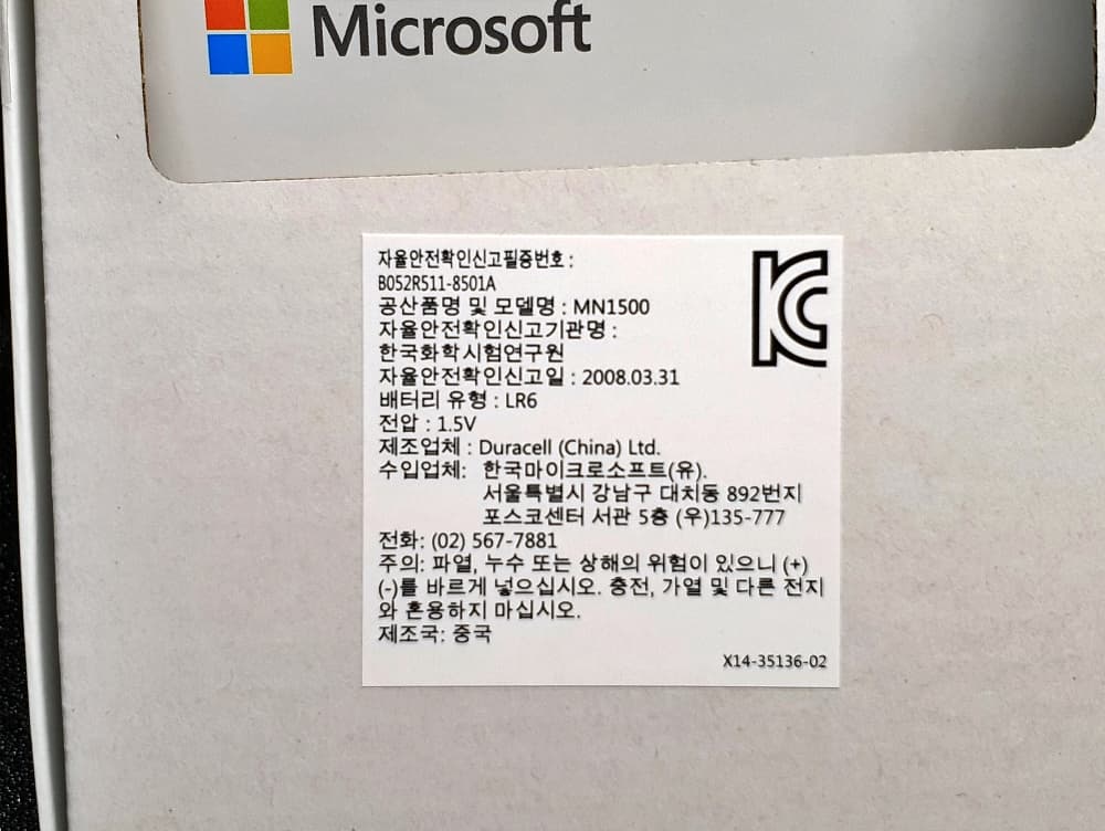 KC마크와 함께 수입업체가 한국 마이크로소프트(유)라고 되어 있습니다. 제조사가 중국 Duracell이라고 되어 있군요.