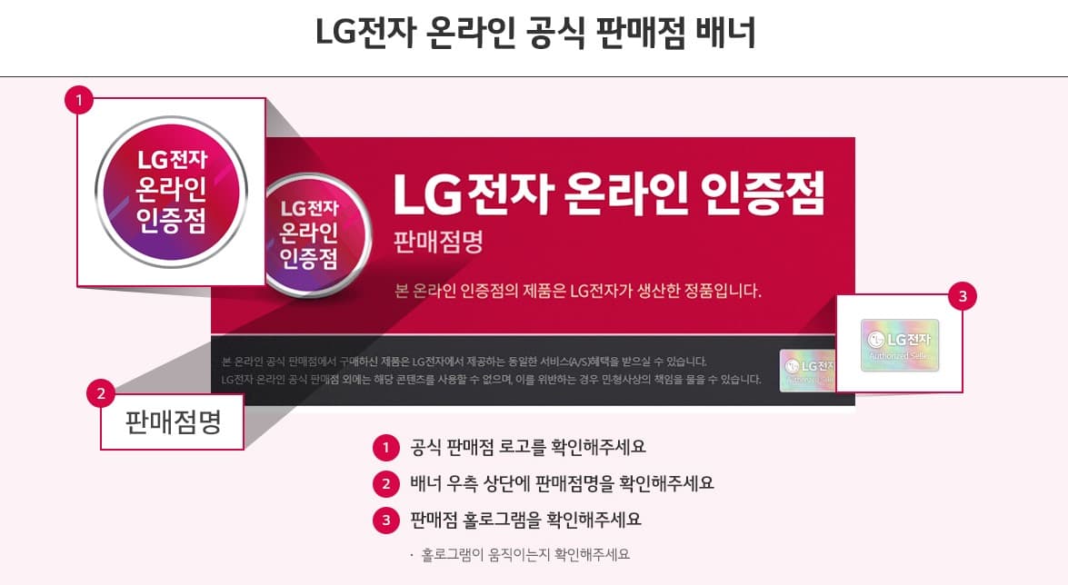 LG전자 온라인 공식 판매점의 경우 판매 페이지에 움직이는 홀로그램으로 LG전자 온라인 인증점 로고를 표시하고 있습니다. 배너 우측에는 판매점명이 반드시 적혀 있어야 합니다.