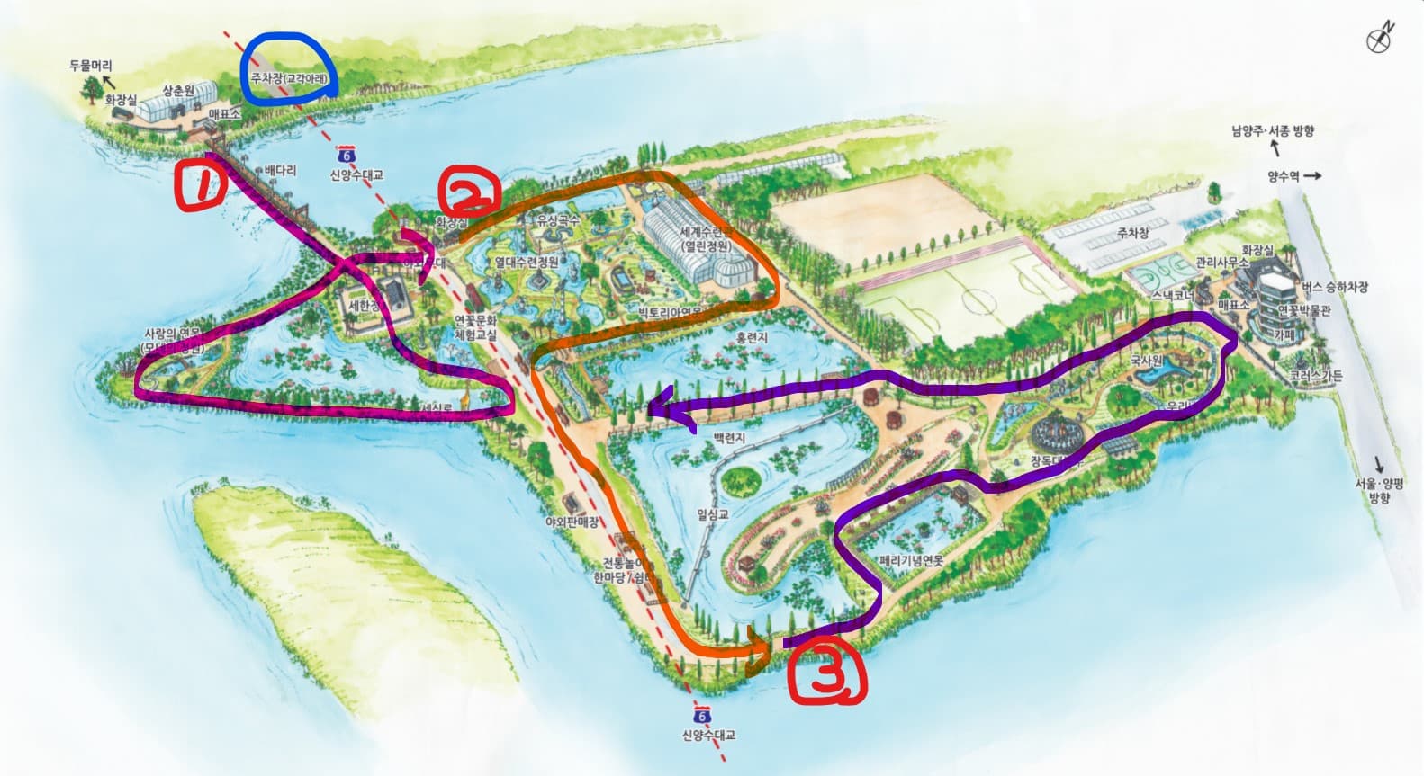 저는 후문으로 들어와서 배다리를 건너 세한정, 사랑의 연못 한 바퀴를 돌고 열대수련 정원을 한 바퀴 돌아 페리 기념 연못으로 해서 정문 쪽 구경하고 홍련지 백련지 사이 길로 내려와서 다시 후문으로 나왔습니다.