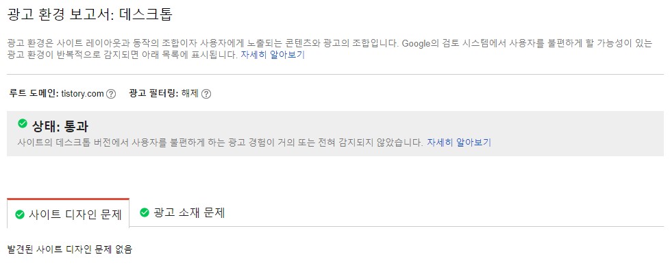 구글 서치 콘솔의 [**광고 경험 보고서**]를 통해 확인할 수 있다고 하는데, 자신의 티스토리가 구글 서치 콘솔에 등록하셨다면 확인하실 수 있습니다.