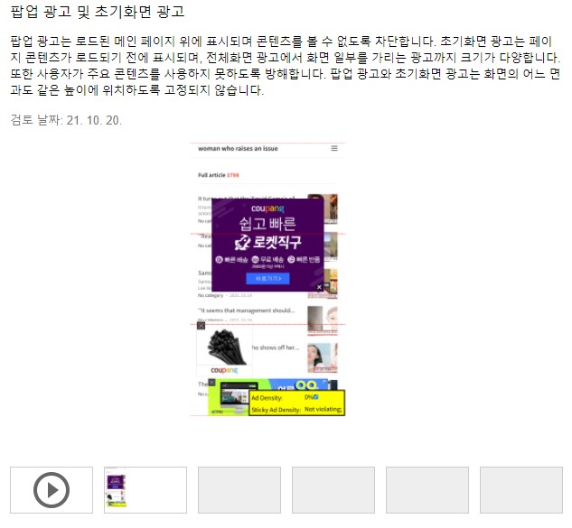 팝업 광고가 초기에 로딩되면서 애드센스를 가려서 생기는 문제인데, 해당 주소도 공개가 되어 있기도 합니다.
