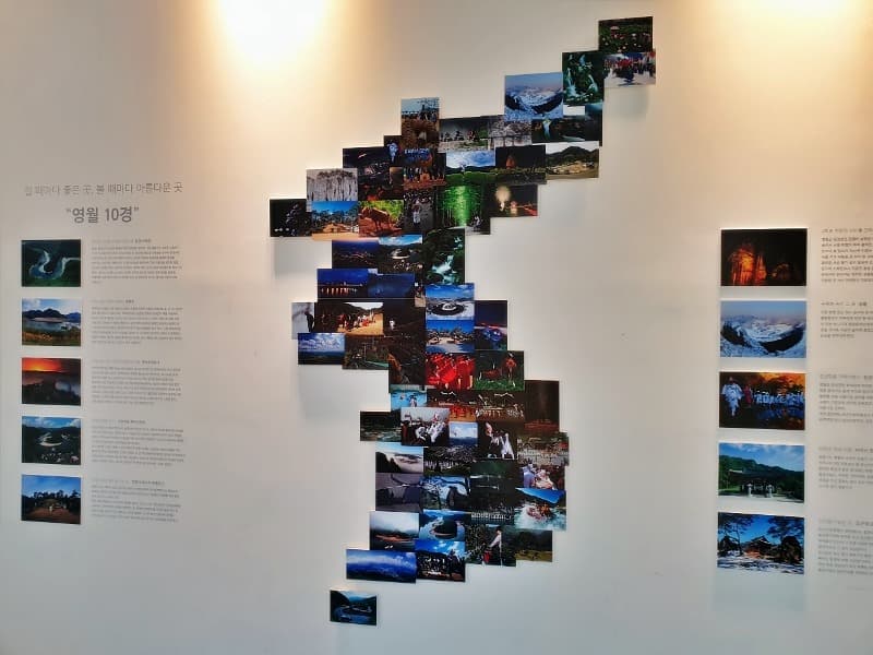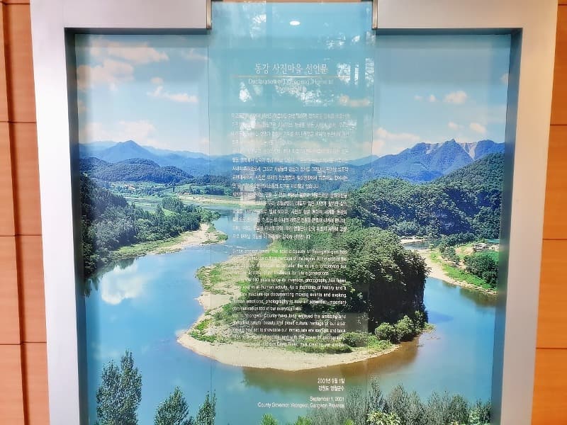 영월의 자랑이라 할 수 있는 한반도 지형을 배경으로 영월의 10경 사진들과 강원도 영월군수의 동강 사진마을 선언문도 1층 벽면에 있었습니다.