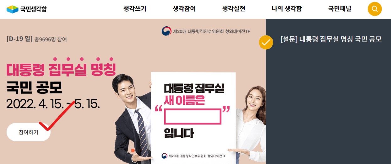 메인화면의 "대통령 집무실 명칭 국민공모" 참여하기 버튼을 클릭합니다.