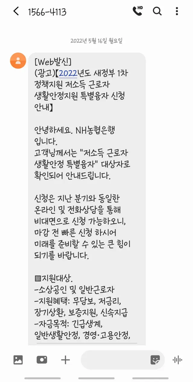 고객님께서는 "저소득 근로자 생활안정 특별융자" 대상자로 확인되어 안내드립니다.