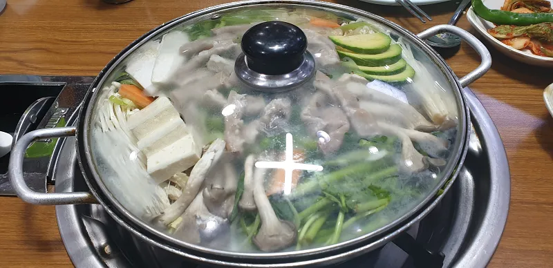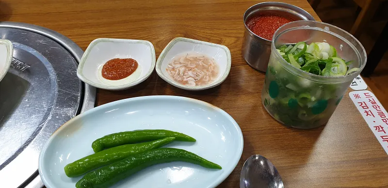 밑반찬 등으로 나오는 건 간소합니다. 김치, 깍두기, 고추와 된장, 새우젓, 양념장, 파 가 나오고 테이블에 소금이나 들깨가루가 별도로 있습니다.