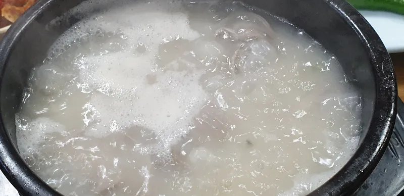 조금 뒤에 팔팔 끓는 순댓국이 나오는데, 뚝배기가 뜨겁습니다.