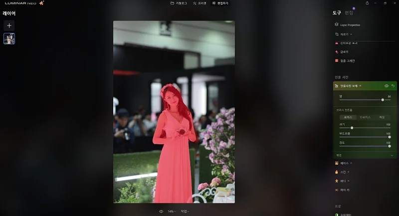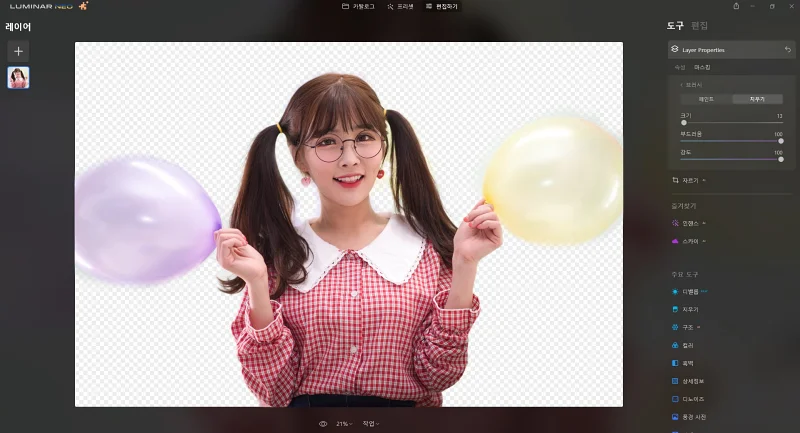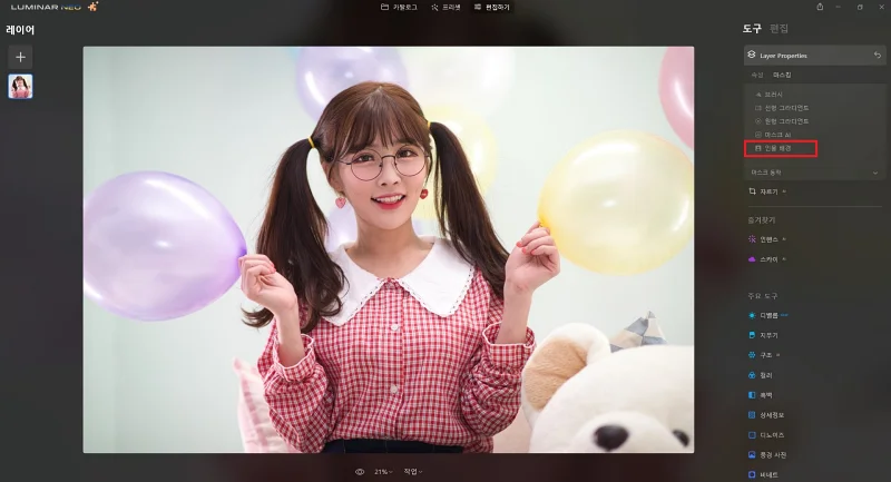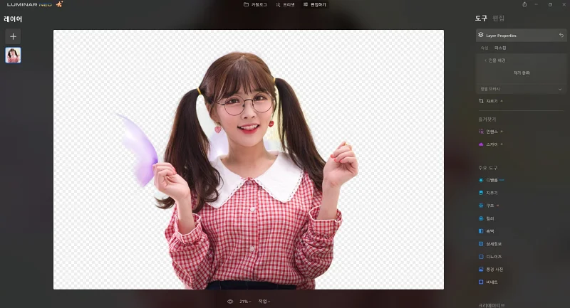 루미나르 네오에서는 인물 배경을 제거하는 놀라운 AI 기능을 갖고 있습니다. 정확도도 제법 높은 편이고요.