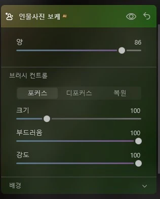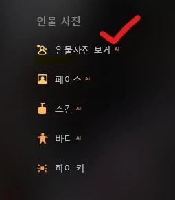 우측 메뉴의 [**인물사진**] →[**인물사진 보케 AI**]를 선택합니다.