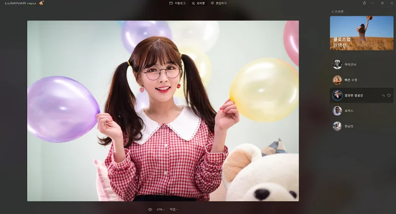 루미나르 네오로 사진을 불러와서, 먼저 메뉴 상단의 프리셋을 이용하여 사진 후보정을 먼저 해주겠습니다.