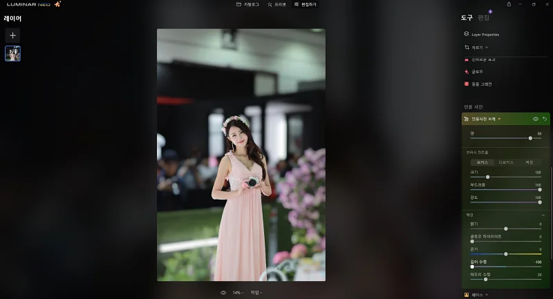 또한, 인물 사진을 좀 더 뚜렷이 하기 위해 밝은 렌즈로 아웃포커스 사진을 촬영하곤 하는데요. 이 역시도 루미나르 네오의 AI 기술로 아웃포커스 사진으로 후보정이 가능합니다. 간단한 마우스 조작만으로 값비싼 밝은 렌즈를 이용하지 않아도 그만한 효과를 낼 수 있는 것이지요.