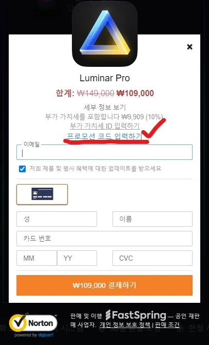 연간 요금제 선택을 하시면 결제 창이 뜨는데, 위 이미지 상에서 보듯 [**프로모션 코드 입력하기**]를 클릭하여, 위 프로모션 할인 코드를 기입하고 적용 버튼을 눌러주세요.