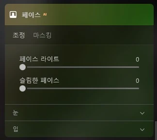 페이스 AI에서는 얼굴 윤곽을 슬림하게 만들어 줄 수 있고, 눈과 입에 여러 효과로 변화를 줄 수 있습니다.