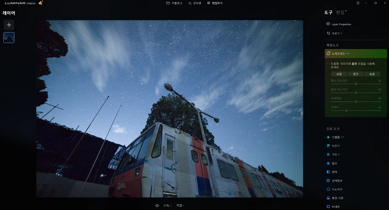 사용자가 직접 노이즈 감소 레벨을 조정하는 것도 가능합니다. 또한, 광도, 색상, 디테일 슬라이더로 결과물을 더욱 정밀하게 제어할 수 있습니다.