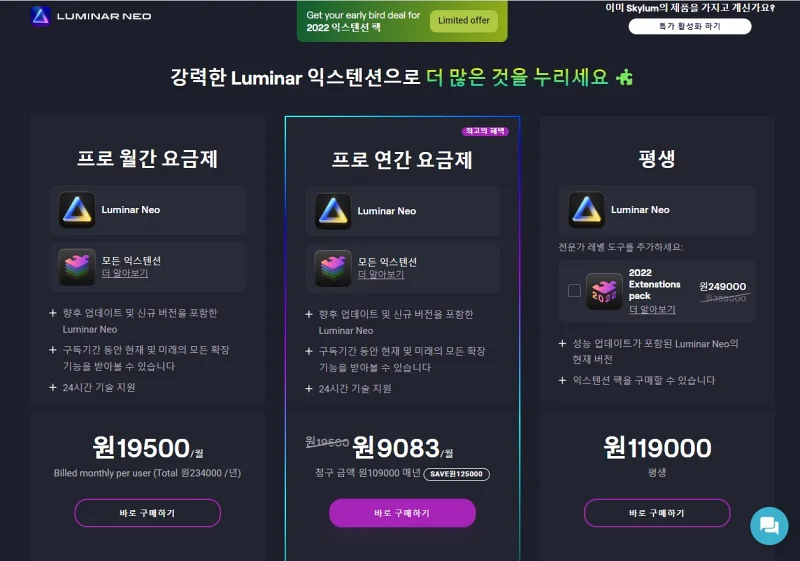 익스텐션 팩은 기존 루미나르 Neo 구독/구매 외 추가 구독 및 구매를 하여야 합니다. 프로 연간 요금제와 2022년 확장팩이 있는데, 2022년 확장팩만이라도 구매하시면 사진 생활에 도움이 될 것이라 생각합니다.