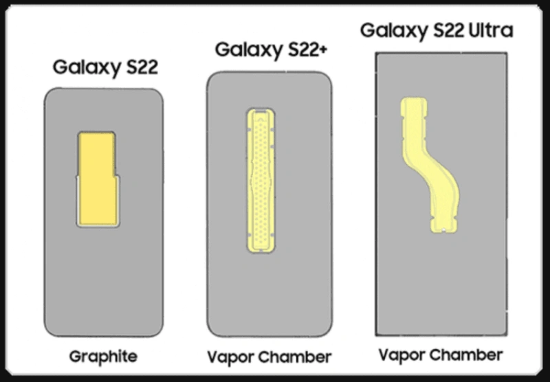 베이퍼 챔버(Vapor chamber)는 대량의 열을 방열하여 주는 역할을 하는데요. S22에서는 엑시노스 CPU를 사용하였는데 발열이 심함에도 적은 크기의 베이퍼 챔버를 사용하였었고, 이번 S23시리즈에서는 스냅드래곤 8 Gen 2를 탑재하여 CPU의 발열이 엑시노스보다 적음에도 쿨링시스템인 베이퍼 챔버를 더 크게 하여 그 방열의 효율이 높아졌습니다.
