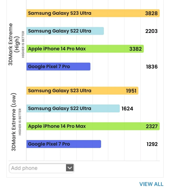 갤럭시 S23 Ultra의 GPU 피크 성능은 아이폰 14 Pro Max 보다 13% 빠르지만, 유지 성능은 아이폰 14 Pro Max가 19% 빠른 것으로 확인되었습니다.